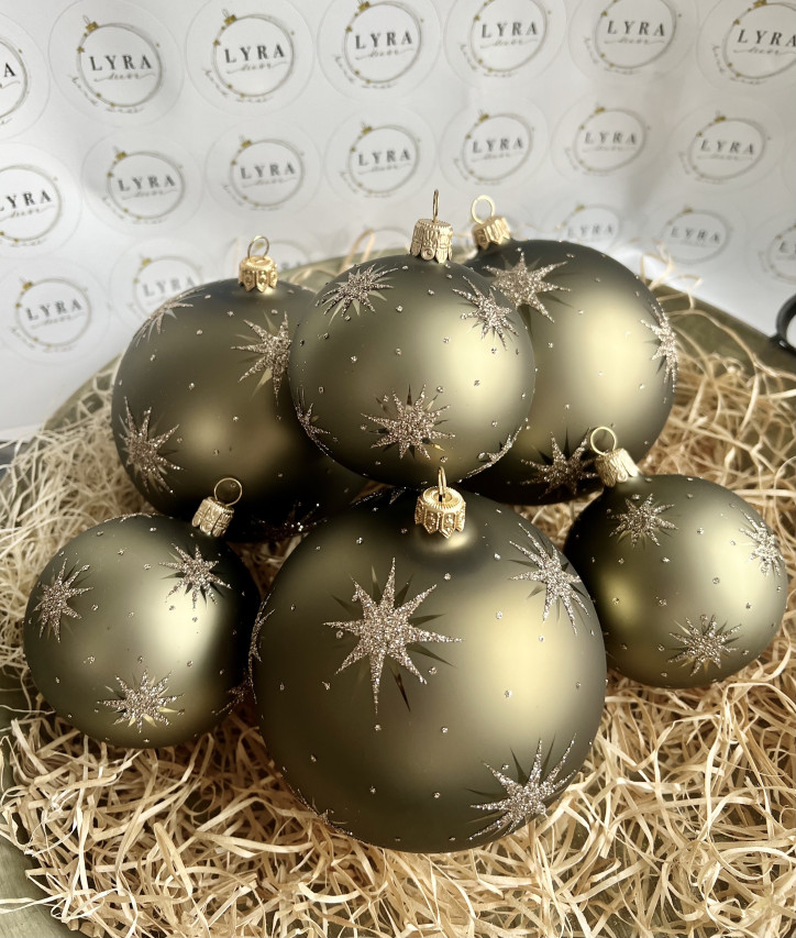 Decentní provedení vánočních ozdob. Třpytivé platinové hvězdičky na khaki zeleném podkladu.