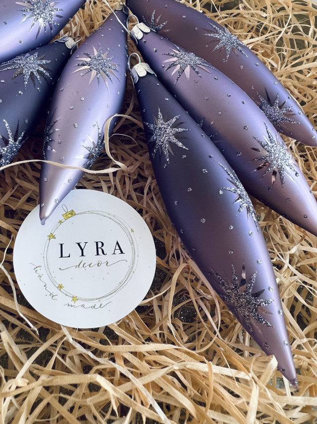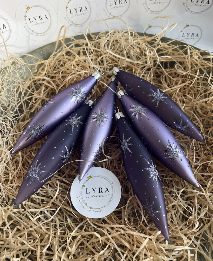 Decentné prevedenie vianočných ozdôb. Trblietavé hviezdičky na fialovom podklade.