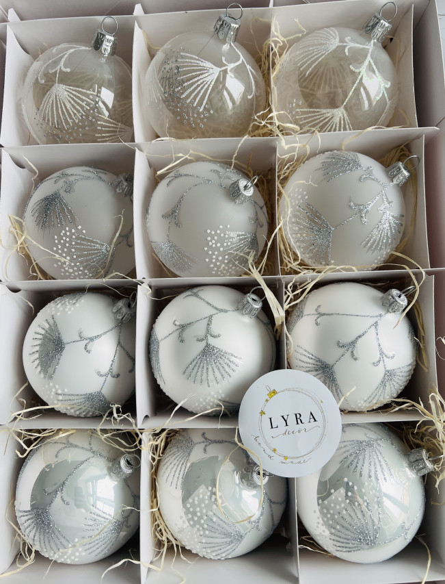 | Sada po 12 ks | Ide o 7cm veľkú, sklenenú ozdobu. Sada obsahuje 12 ks (6x strieborná guľa, 6x číra guľa). |